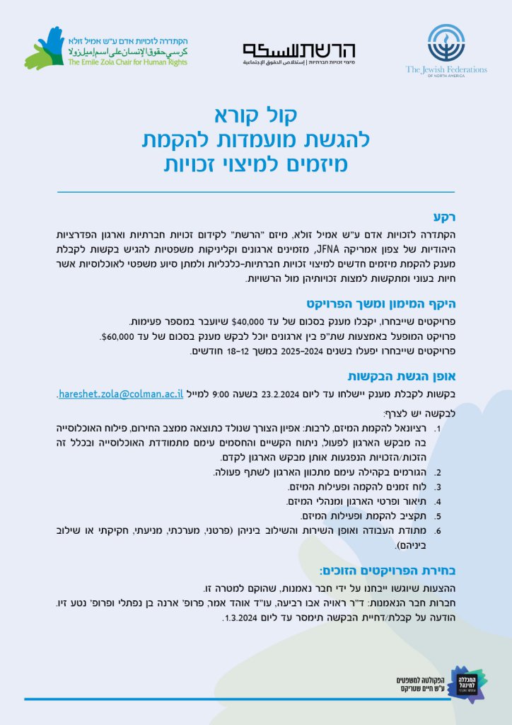 הקתדרה לזכויות אדם על שם אמיל זולא, מיזם "הרשת" לקידום זכויות חברתיות, וארגון הפדרציות היהודיות של צפון אמריקה, מזמינים ארגונים וקליניקות משפטיות להגיש בקשת מענק להקמת מיזמים חדשים למיצוי זכויות חברתיות-כלכליות, ולמתן סיוע משפטי לאוכלוסיות אשר חיות בעוני ומתקשות למצות את זכויותיהן מול הרשויות.